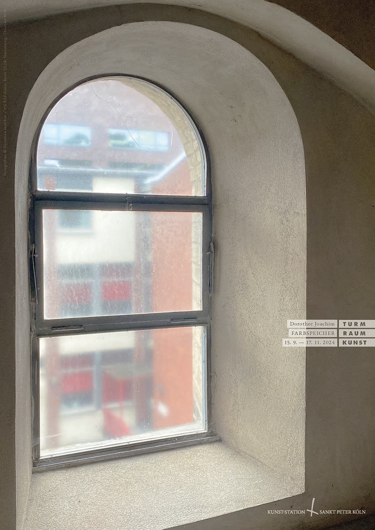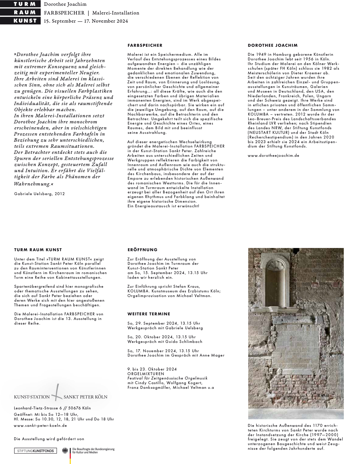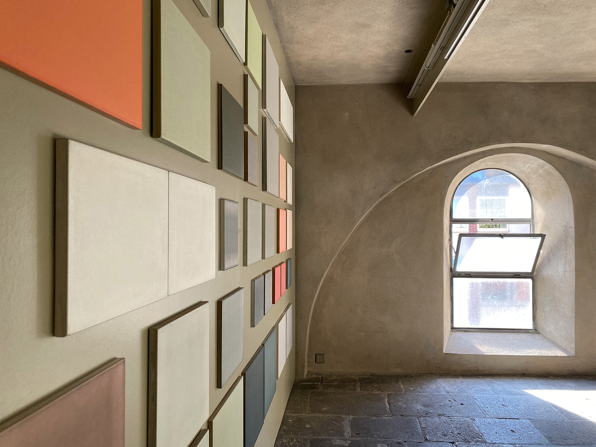 ortsbezogene Malerei-Installation im Turmraum der Kunst-Station Sankt Peter Köln mit 40 Arbeiten aus den Jahren 1996 – 2021, Pigmente und Acryl auf Nessel bzw. MDF/Multiplex,
