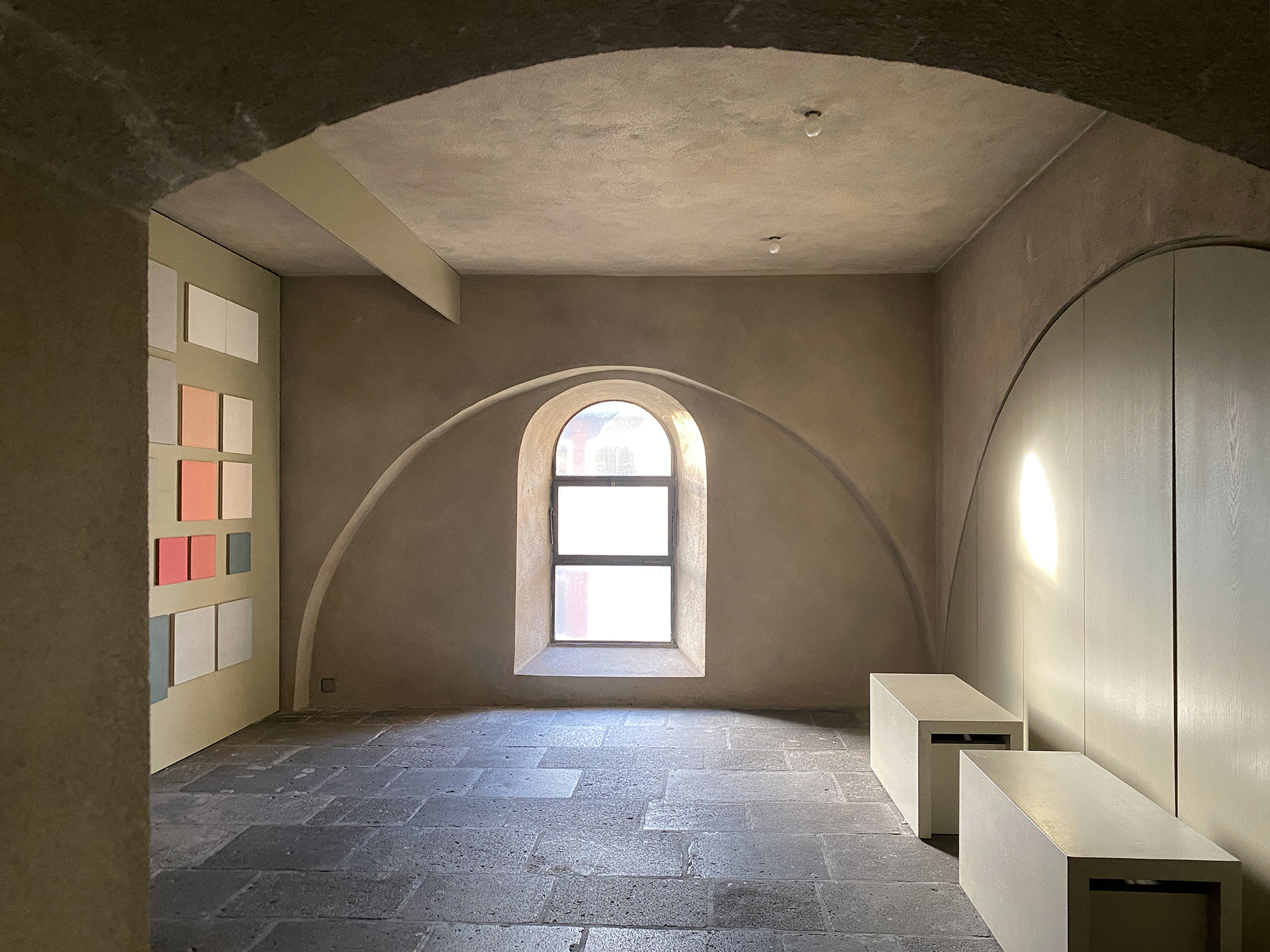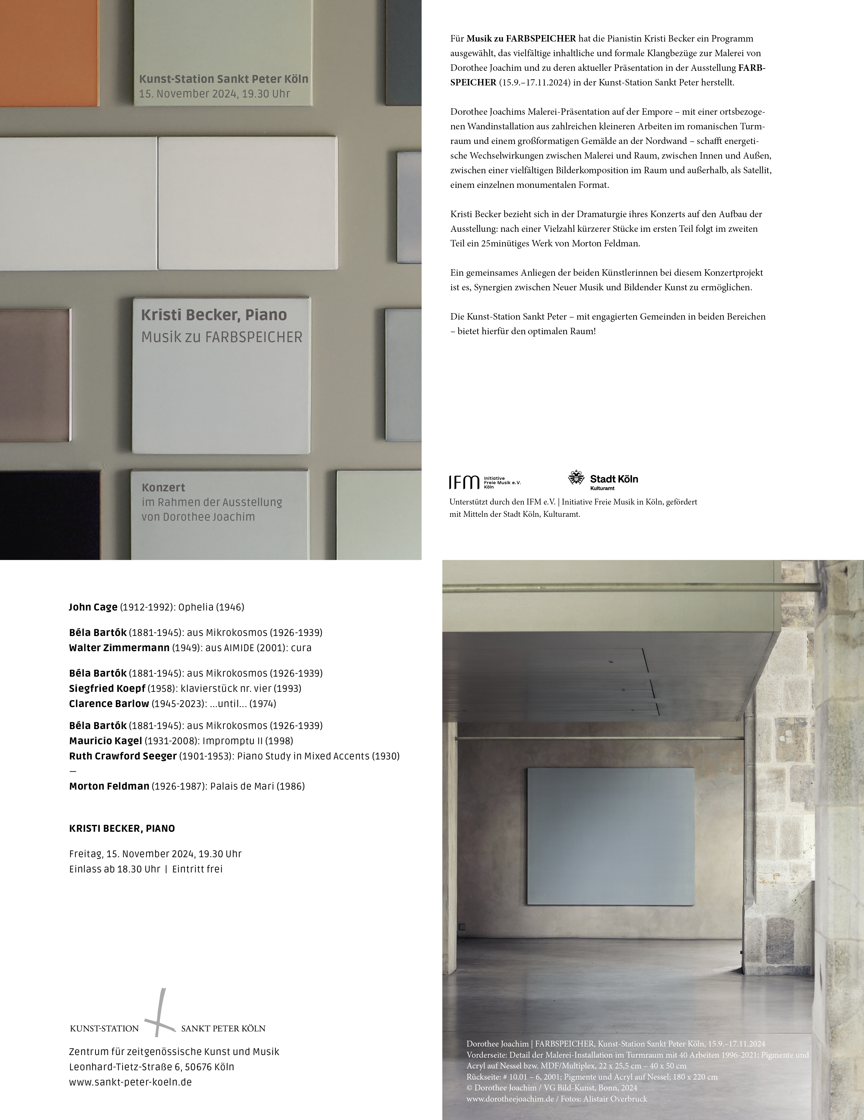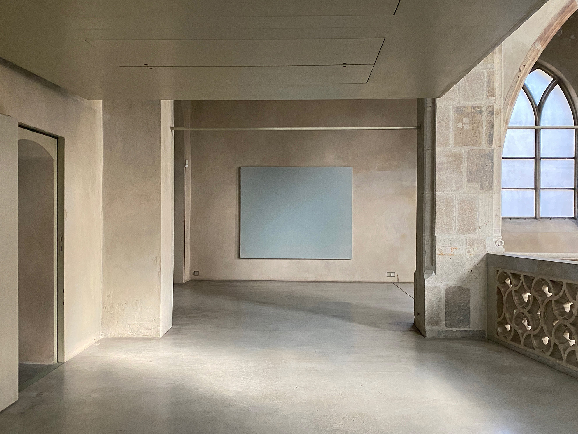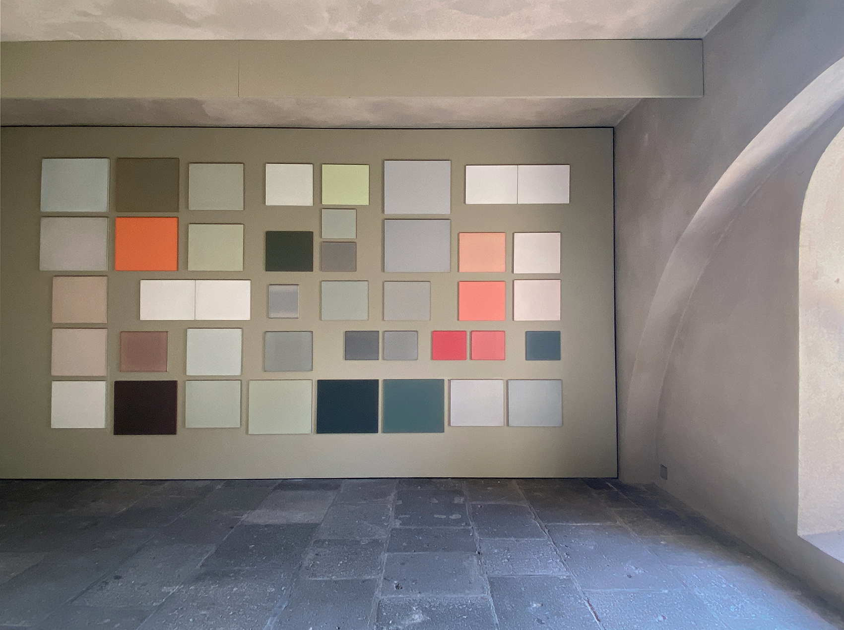ortsbezogene Malerei-Installation im Turmraum der Kunst-Station Sankt Peter Köln mit 40 Arbeiten aus den Jahren 1996 – 2021, Pigmente und Acryl auf Nessel bzw. MDF/Multiplex,