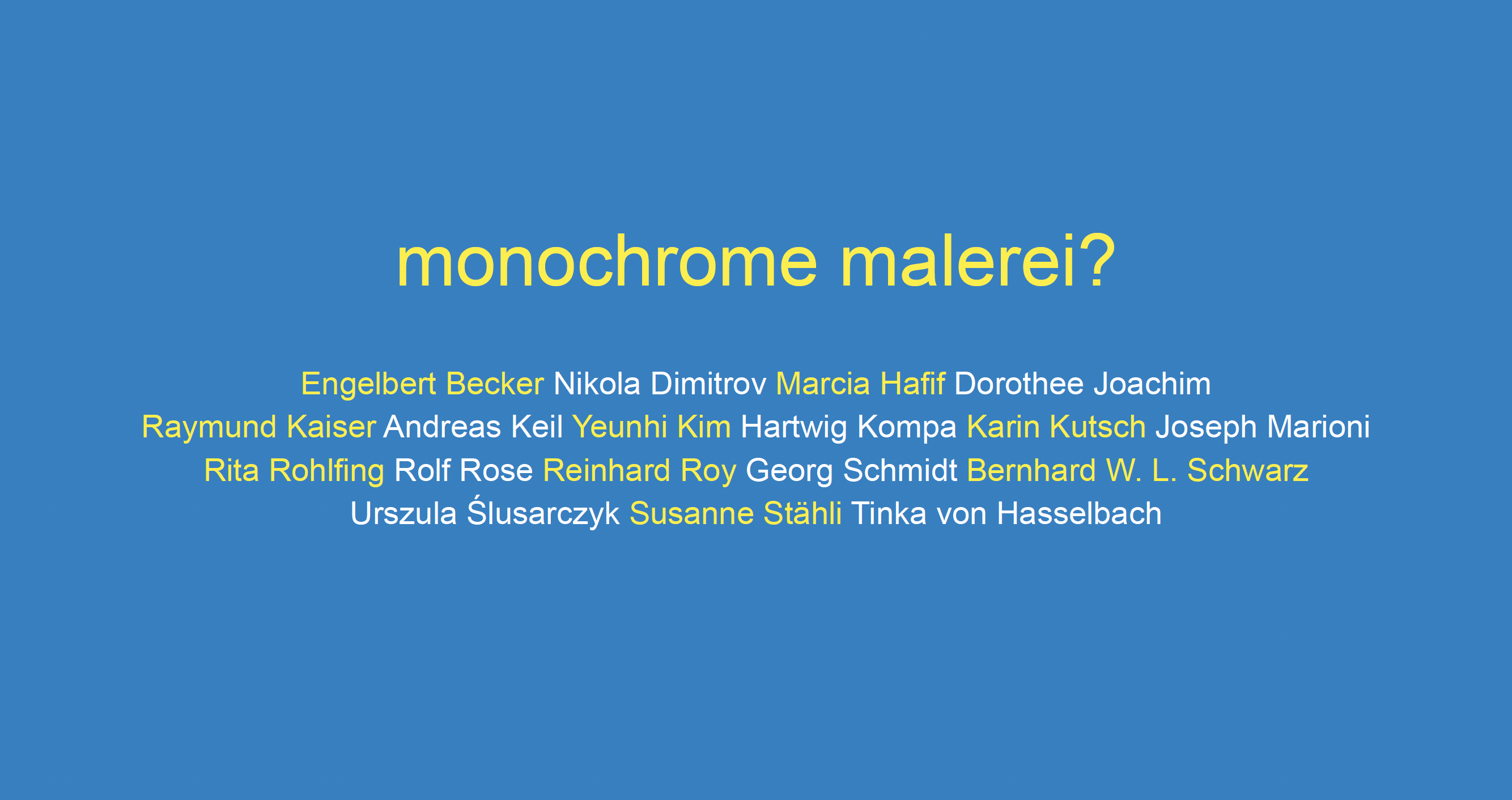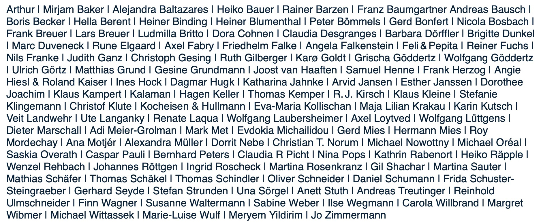 mit Britta Bogers, Christoph Dahlhausen, Claudia Desgranges, Friedhelm Falke, Michael Jäger, Dorothee Joachim, Andreas Keil, molitor&kuzmin, Michael Krupp, Marlon Red, Thomas Reifferscheid, Ivo Ringe, Rita Rohlfing, Stephan Siebers.